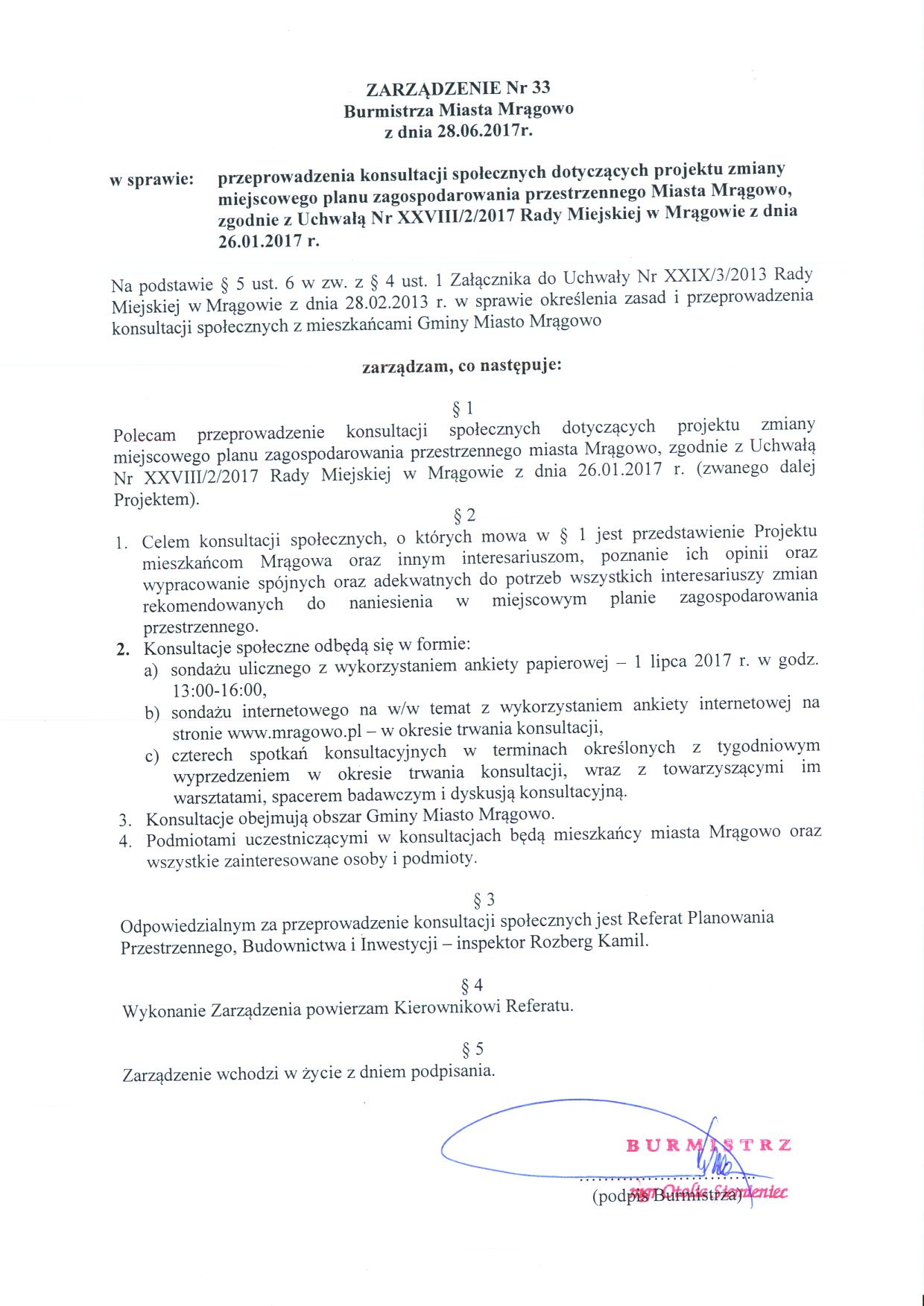 Zgodnie z Zarządzeniem nr 33 Burmistrza Miasta Mrągowo z dnia 28.06.2017 r. ogłaszam przeprowadzenie konsultacji społecznych dotyczących projektu zmiany miejscowego planu zagospodarowania przestrzennego miasta Mrągowa.