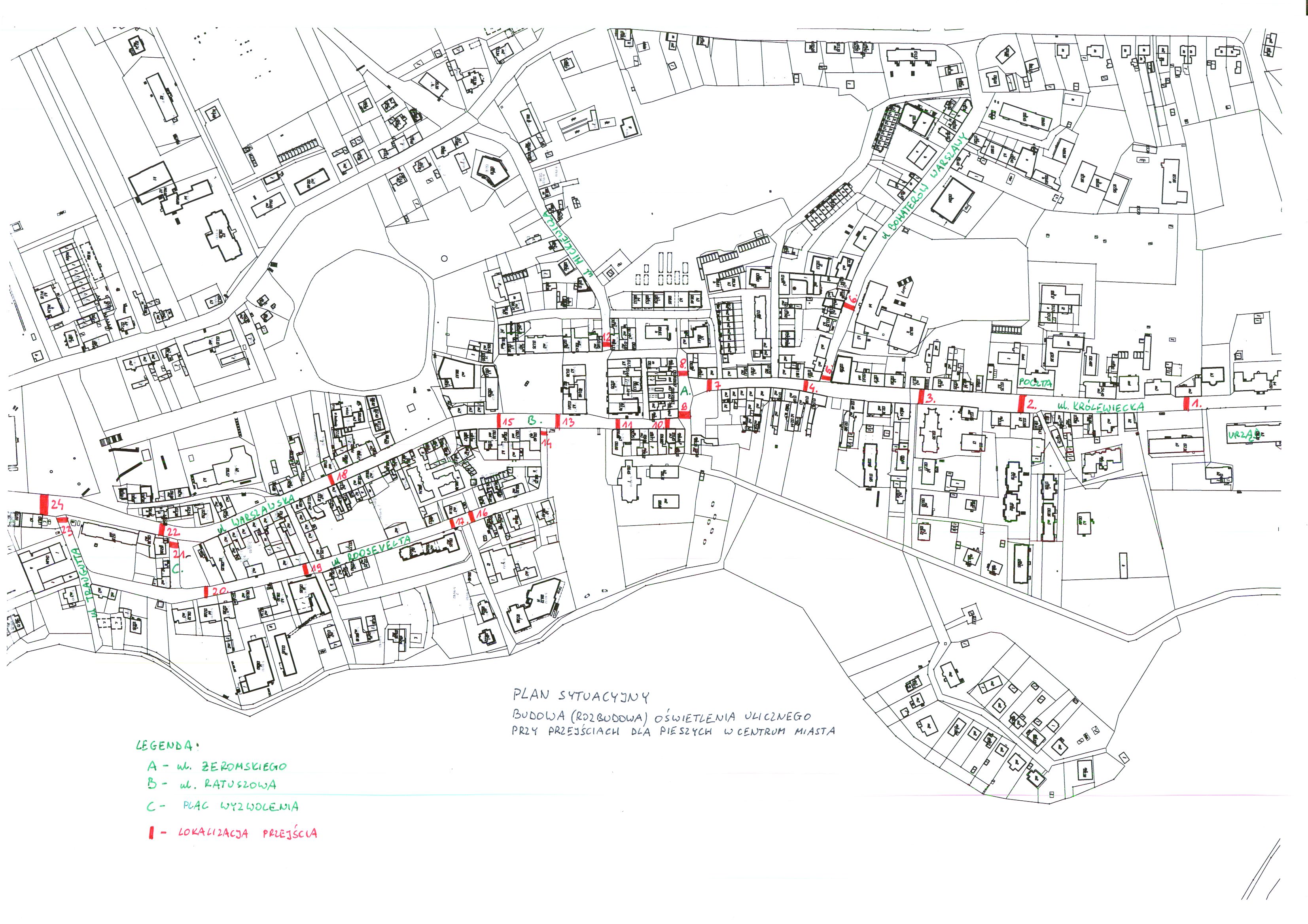 - Opracowanie dokumentacji projektowo – kosztorysowej na doświetlenie przejść położonych w ciągu dróg gminnych, na ulicach Królewieckiej (5 przejść), Bohaterów Warszawy (2 przejścia), Żeromskiego (2 przejscia), Ratuszowej (4 przejścia), Mickiewicza (1 przejście), Warszawskiej (3 przejścia), Roosevelta (5 przejść), Traugutta (1 przejście), Placu Wyzwolenia (1 przejście). Plan sytuacyjny z lokalizacją przejść w załączeniu.