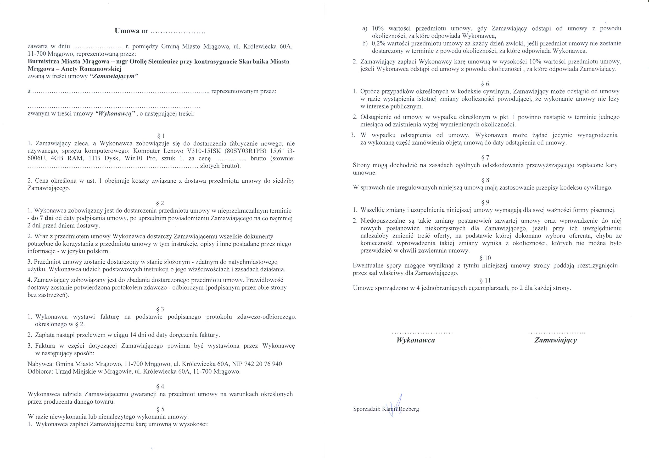 Do udzielania wyjaśnień dotyczących zamówienia, ze strony Zamawiającego upoważniony jest Kamil Rozberg, tel. 89 741-90-18, e-mail: k.rozberg@mragowo.um.gov.pl