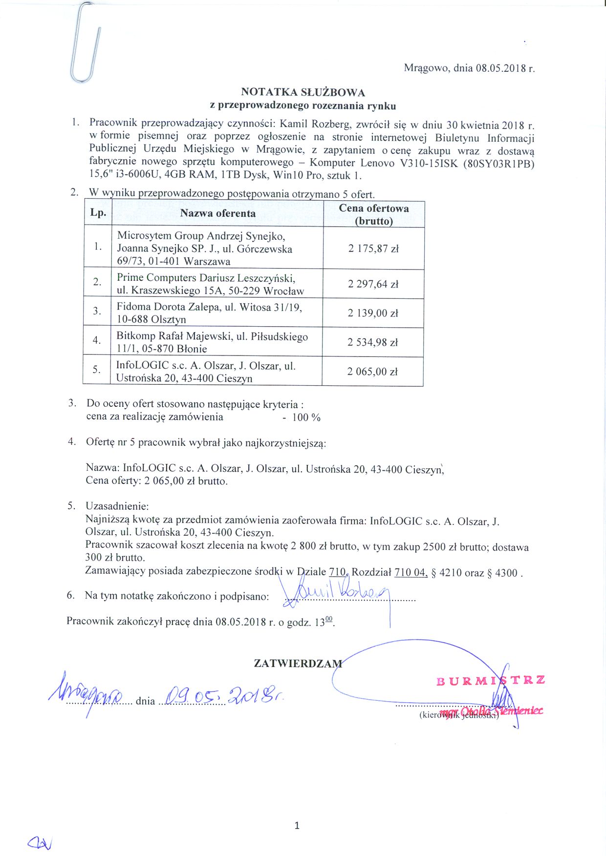 Ofertę należy przesłać na adres k.rozberg@mragowo.um.gov.pl do dnia 08.05.2018 r. do godziny 12:00. Oferta powinna zawierać łączną wartość brutto.