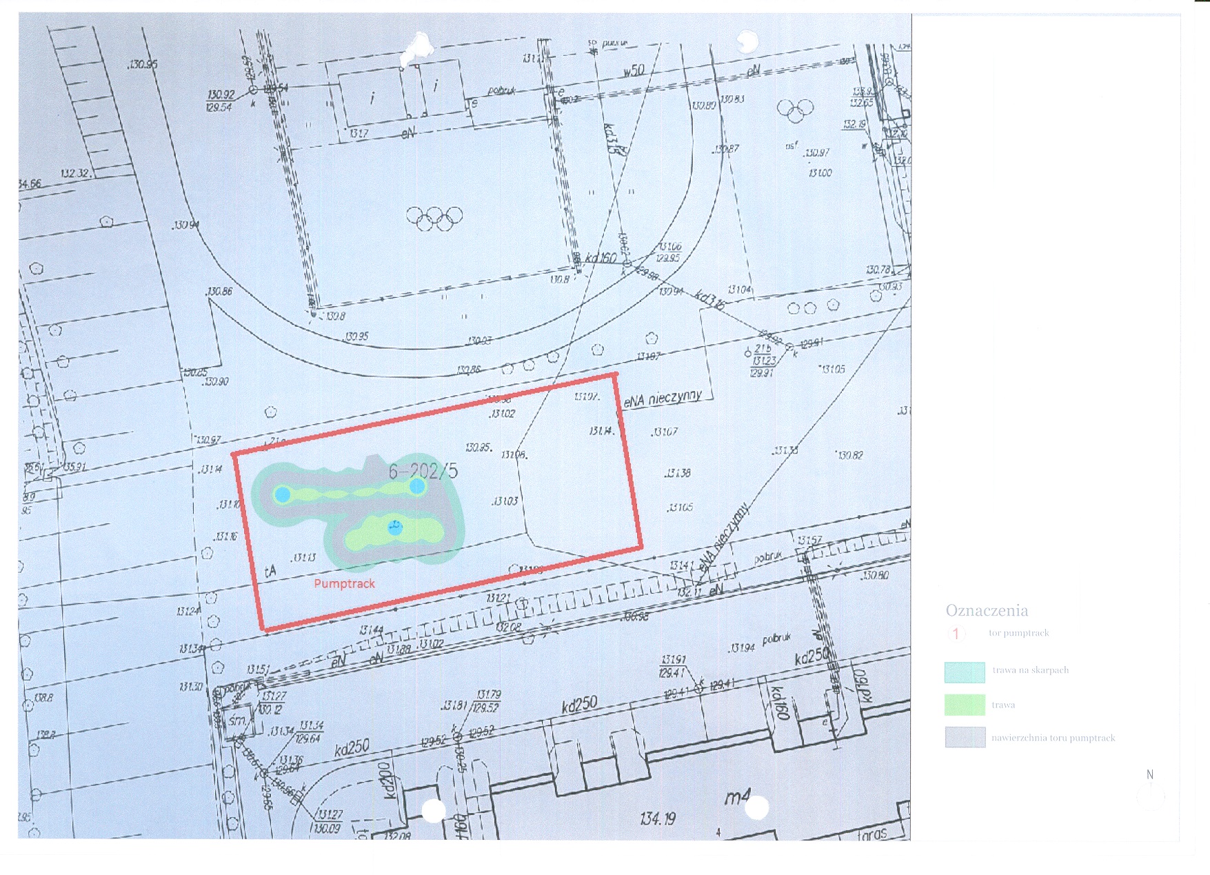 - Tor rowerowy typu „pumptrack” należy zlokalizować przy ul. Żołnierskiej 6, dz. nr 6-202/5, zgodnie z załączonym planem sytuacyjnym (Zał. Nr 3) oraz Miejscowym Planem Zagospodarowania Przestrzennego.