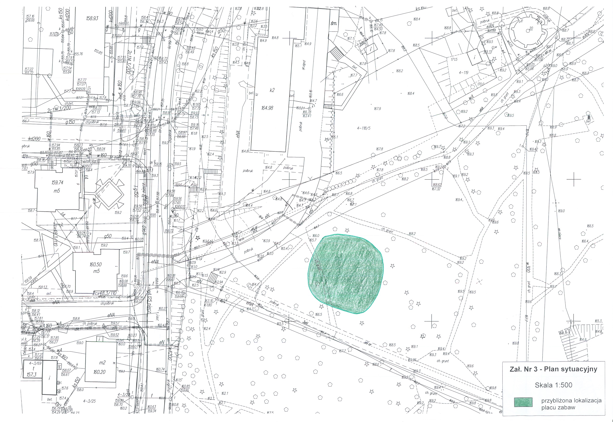 1. Plac zabaw dla dzieci należy zlokalizować w Parku Sikorskiego w Mrągowie na działce nr 120/3 obręb 4 Miasto Mrągowo, zgodnie z załączonym planem sytuacyjnym (Zał. Nr 3) oraz Miejscowym Planem Zagospodarowania Przestrzennego, a także dostosować do planu zagospodarowania terenu Parku im. Gen. W. Sikorskiego na cele turystyczno – rekreacyjne w celu uniknięcia ewentualnej kolizji (Zał. Nr 4, projektowany obiekt street workout nie będzie wykonywany).