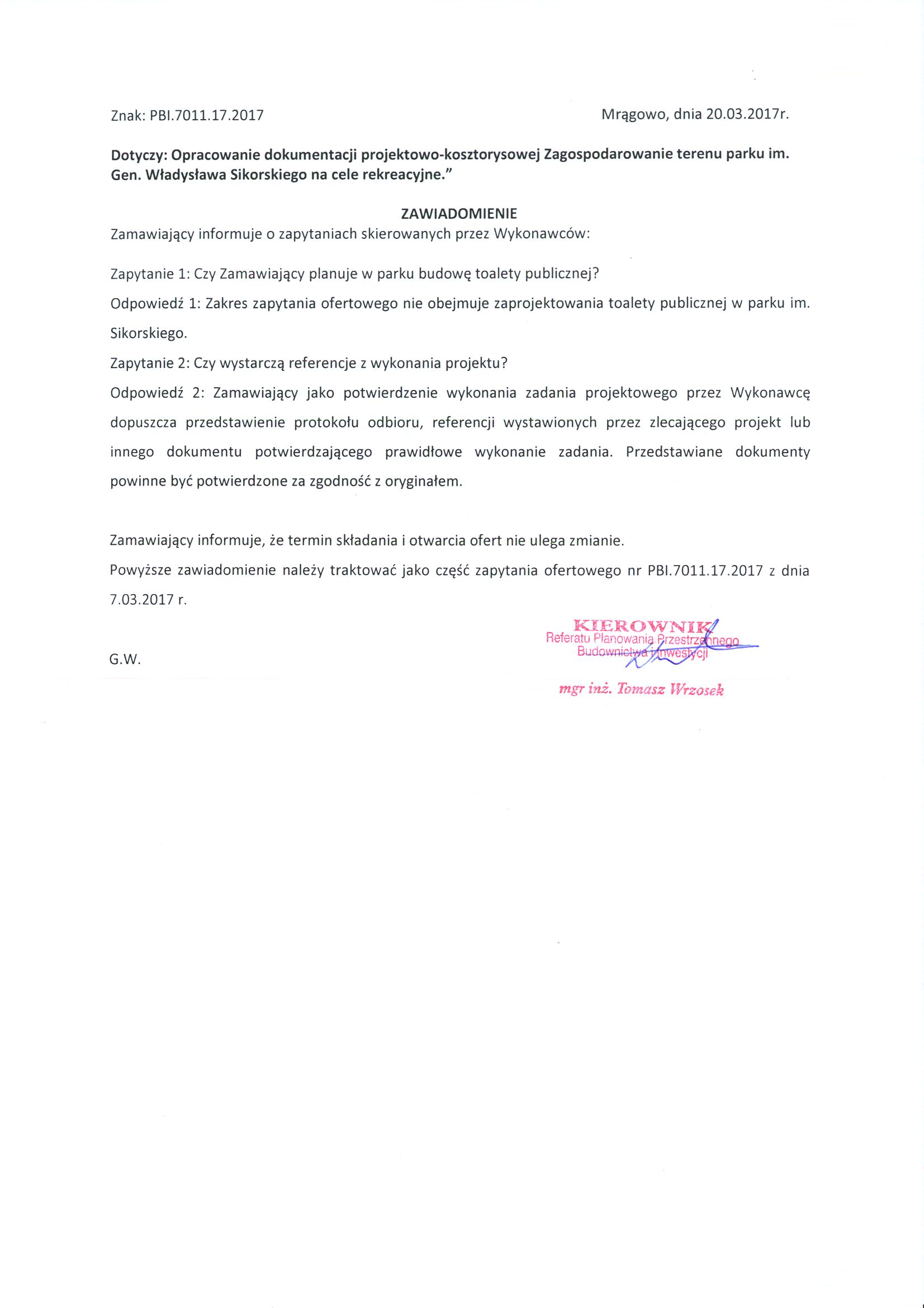 Do udzielania wyjaśnień dotyczących zamówienia, ze strony Zamawiającego, upoważnia się pracowników referatu Planowania Przestrzennego, Budownictwa i Inwestycji: Grzegorza Woźniak tel. (089) 741 9018 oraz Tomasza Wrzosek tel. (089) 741 9028.