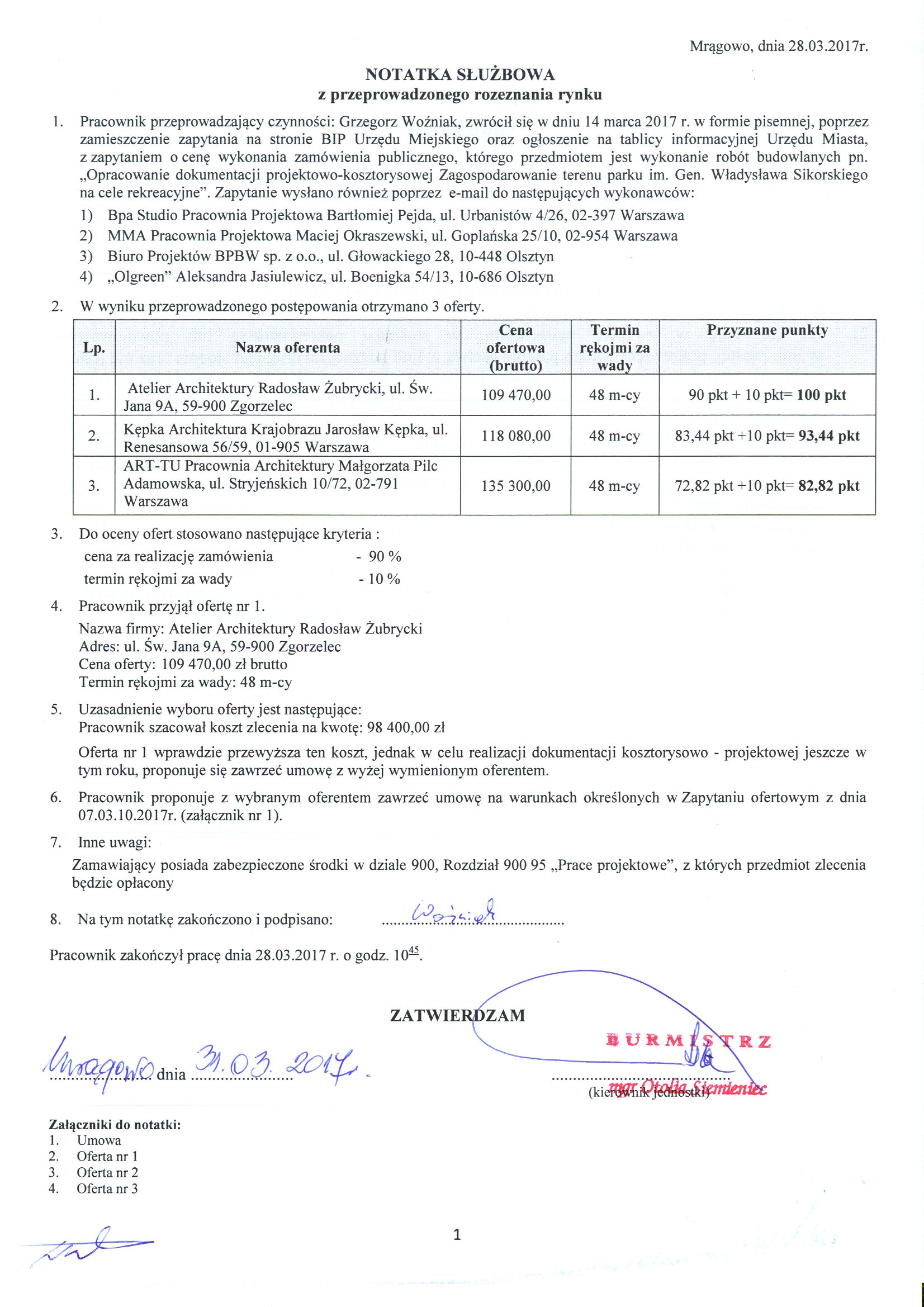 1. Ofertę należy składać drogą korespondencyjną na adres: Gmina Miasto Mrągowo, 11-700 Mrągowo, ul. Królewiecka 60A lub drogą elektroniczną na adres g.wozniak@mragowo.um.gov.pl do dnia 28.03.2017r. do godz. 1000.